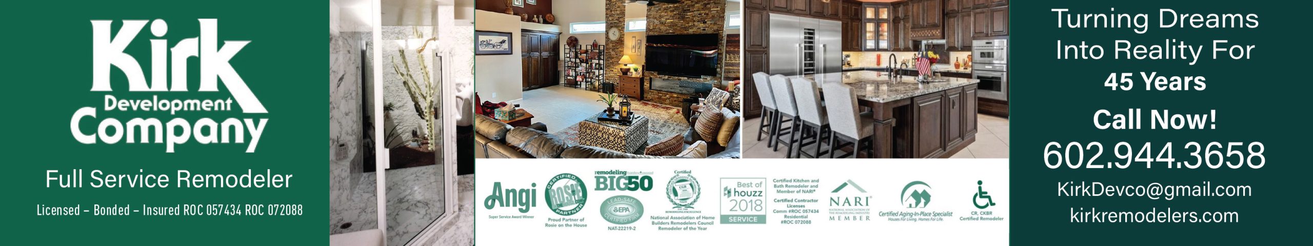 Kirk Development is one of the only remodelers in Arizona that are certified by both the National Association of Home Builders (CGR) and the National Association of the Remodeling Industry (CR).